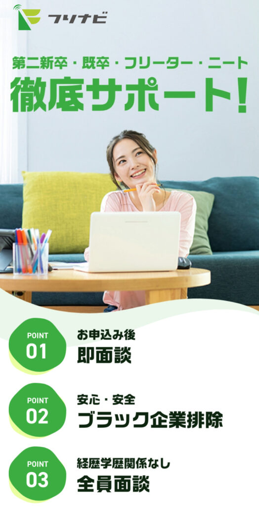 フリナビは、第二新卒・既卒・フリーターからの正社員就職に特化し、未経験でも応募できる求人が豊富な転職エージェントです。