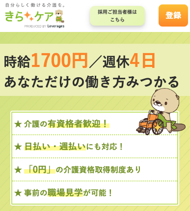 | おすすめポイント | 介護業界の幅広い職種の求人 施設は日本全国全国180か所 上場企業ヒューマンホールディングスの100%子会社 研修・フォロー体制が整備 働きながら資格を取得するための支援制度 大手企業ならではの充実した福利厚生 産休・育休取得からの復帰率83% 独自のキャリアアップ制度が充実 費用負担なく企業選びの選択肢を増やせる |