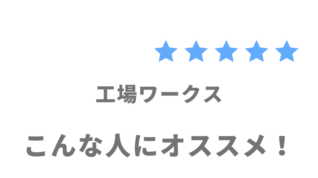 この記事では、工場ワークスの サービス内容 や 利用がおすすめな人の特徴、さらには 利用者の評判・口コミ まで詳しく解説していきます。