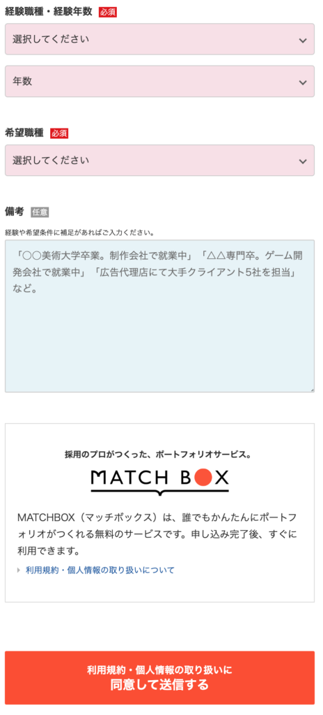 登録して紹介できる求人がないと面談を断られた後は、再度の申込みや登録が出来ない。ポートフォリオサイトも使いづらい。