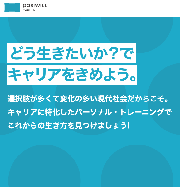 中でも、20代・30代向けのキャリアコーチングで受講者数No.1を誇るポジウィルキャリアは、自己分析を通じて自分のキャリアの軸を見つけ、理想の働き方を実現するためのパーソナルトレーニングを提供しています。
