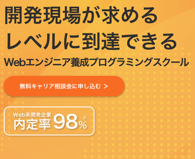 | おすすめポイント | 創業以来すべての転職成功者の98%がWeb系開発企業に内定の実績 Web系開発会社が運営しているので実践的な技術が身につく レベルの高いポートフォリオの作成サポートがあり履歴書以上の証明になる 困った時に相談できるバディ制度で徹底したサポート 転職サポートが徹底しているので就職に強い 卒業後も学習カリキュラムやコミュニティを利用できる 受講料の70%(最大385,000円)が給付される 無料キャリア相談で詳しい学習内容やエンジニア転職に関して相談することができる |