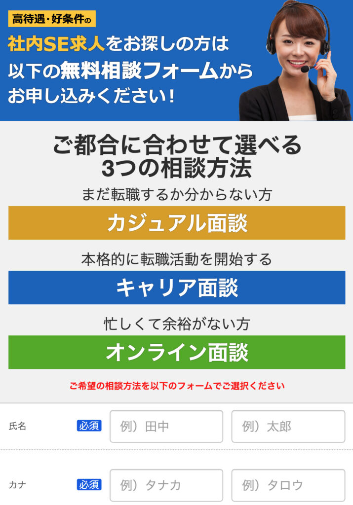 | その他特徴 | IT業界トップクラスの社内SE求人数 社内SEのリアルを隅々まで公開 セミナーやイベントなどサポートが充実 転職支援実績は15,000人以上で、多くの社内SE転職実績がある 3種類の相談方法でストレスなく転職相談が可能 転職を迷っている人も相談や情報収集でも利用が可能 利用料が無料で費用負担なく企業選びの選択肢を増やせる |