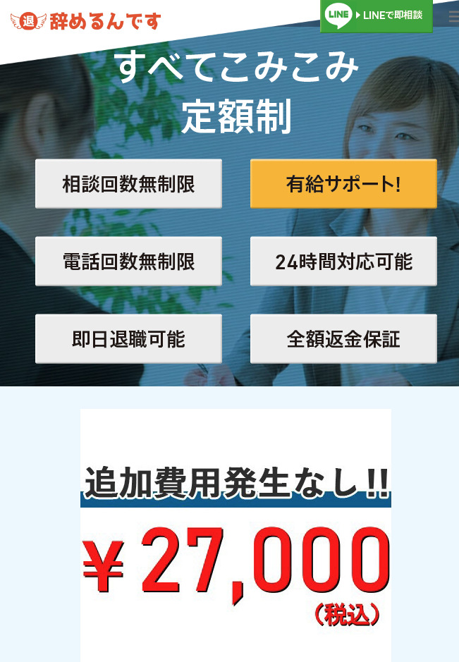 | おすすめポイント | 退職成功率100%の退職代行サービス 「弁護士×民間」で確実性が高く低料金 最短即日退職代行が可能 退職に関して問題が起きたときの顧問弁護士の対応保証付き 万が一退職ができない場合は全額返金 転職支援のサポート 顧問社労士監修で希望に応じて退職給付金など公的支援制度のサポート LINEの無料相談が充実 |