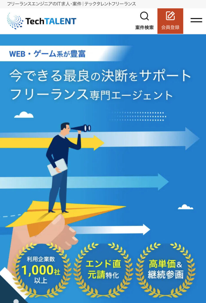 特にWeb・ゲーム業界に特化した案件を扱い、案件参画後の手厚いフォロー体制が整っているテックタレントフリーランスは、フリーランスエンジニアの間でも人気のエージェントの一つです。