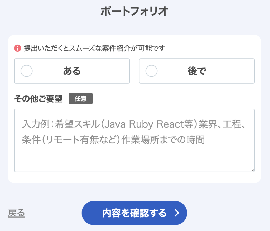 前の現場で急波ブロジェクトが終了したこともあって短期間で進めてもらえて頼もしかった。募集中のプロジェクトから理想に近い案件を探せたことも満足に繋がったのかもしれません。