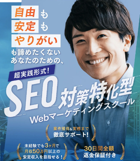 | おすすめポイント | SEOのマーケターに特化したWebマーケティングスクール SEO×フリーランスに特化している 現役のプロのマーケターの指導 実際に案件を獲得するまでの流れを習得することができる 卒業生との交流もあり実際の案件獲得に関する相談もできる 案件獲得できる書類作成のサポート 卒業後もオンラインやイベントで交流ができる 卒業後も最新のコンテンツが閲覧でき鮮度の高い情報が見れる 満足がいかなければ全額返金保障がある |