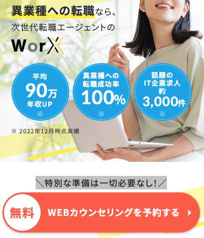 そんな方におすすめなのが、未経験からの異業種転職に特化し、転職後の平均年収を90万円アップさせる実績を持つ【WorX(ワークス)】です。